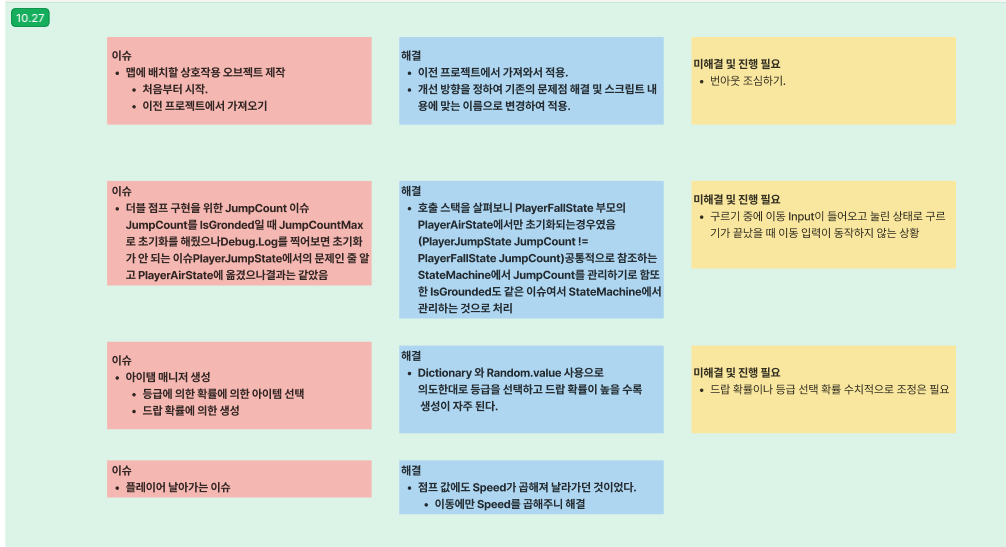 문제점 : JumpCount를 IsGronded일 때 JumpCountMax로 초기화를 해줬으나 Debug.Log를 찍어보면 초기화가 안 되는 이슈, PlayerJumpState에서의 문제인 줄 알고 PlayerAirState에 옮겼으나 결과는 같았음
