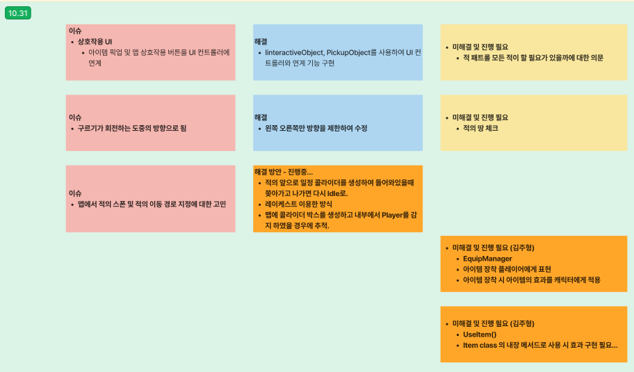 오늘은 적 상태머신을 만들기 위해 플레이어 컨트롤러와 플레이어 상태머신의 공통적인 부분을 분리한 뒤 이 부분을 적 컨트롤러와 적 상태머신이 상속받게 했다. 생각보다 큰 작업이어서 테스트하는데도 시간이 좀 걸렸고 좋았던 부분은 다시 내 코드를 보면서 아 이런 방식으로 작성했었지 하면서 다시 공부하게 되는 시간이 됐던 것이다. 내일은 패트롤 상태를 구현하게 되는데 빨리빨리 구현해서 프로토타입을 완성할 수 있었으면 좋겠다. 내일도 파이팅!