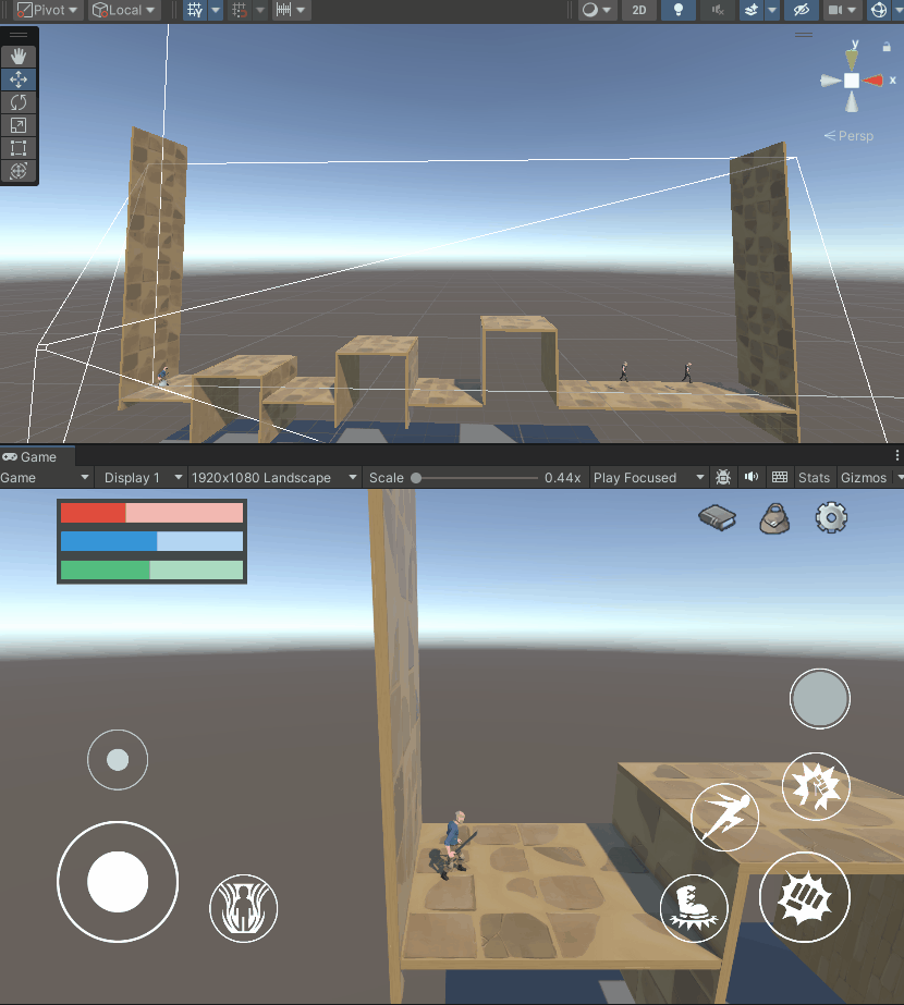 이번 주에 만든 적 패트롤, 추적, 공격과 플레이어 연속 공격을 한 씬에 넣어서 테스트 했다.