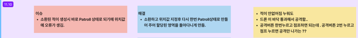 오늘은 플레이어의 죽음 상태를 추가하고 중간 발표 준비를 진행했다. TIL과 회고 노트를 보면서 자료들을 잘 살펴봤는데 한 것을 글로만 적는 것보다 이미지나 gif가 있는 게 더 좋다는 생각이 들었다. 다음부터는 하나 진행할 때마다 캡처도 잘 하는 습관을 들여야겠다.