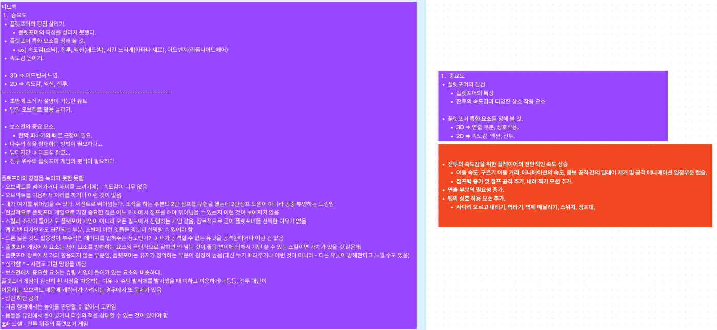 그래서 팀원들끼리 의논해본 결과 플랫포머의 특성에 맞게 각 플랫폼과 상호작용 할 수 있는 기능들을 늘리고 액션 게임에서의 속도감을 위해 캐릭터 속도 스탯을 조정하거나 공격 캔슬을 만든다던지 또는 타격 연출을 추가 한다던지 해서 조정할 생각이다.