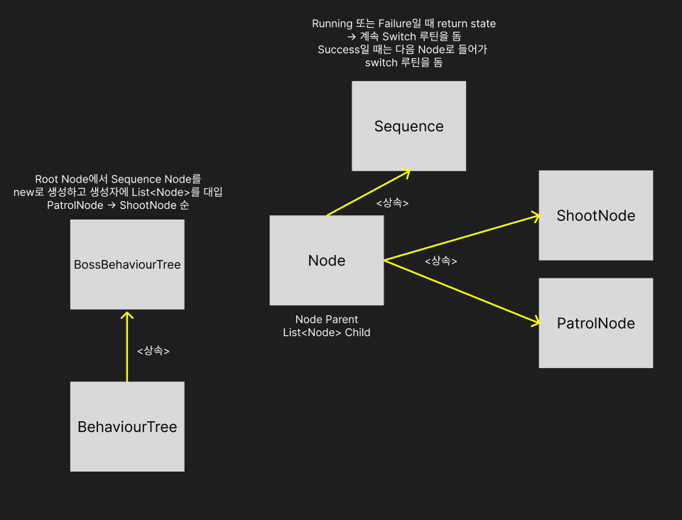 Sequence Node { Patrol Node - 보스가 특정 웨이 포인트로 이동 (도착 시 Success) -> ShootNode - 총알을 발사함 }