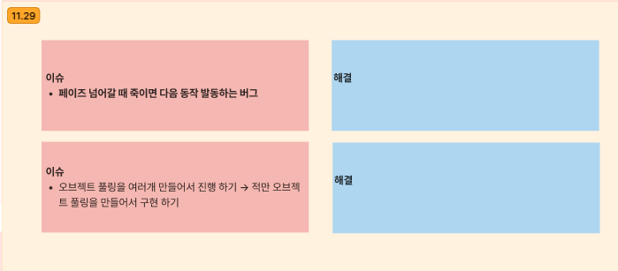 오늘은 어제 있던 샷건 궤적이 플레이어로 안 가고 정면으로만 가는 버그를 수정했고 수류탄이 땅에 꺼지는 버그를 수정했다. 또한 구르기 시 무적을 적용해서 적의 공격을 무시할 수 있게 했다. 오늘 멘토링 시간에 보스와 관련된 부분을 조언받게 되었는데 근접 공격이 필요하다고 해서 내일 구현할 생각이다. 내일도 열심히 해보자. 파이팅!