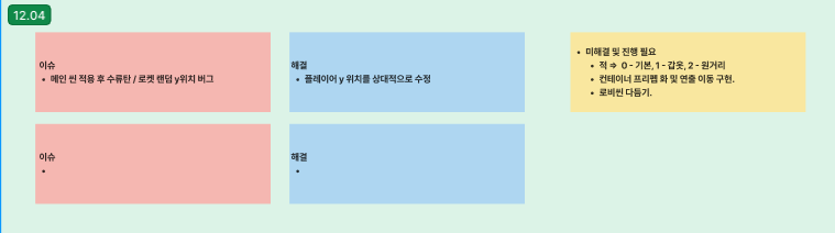 오늘은 메인 씬에 보스 연결하는 작업을 진행했다. 빌드 전 버그를 많이 수정했는데 로켓과 수류탄의 베지어 곡선에서의 중간 y 위치가 잘못되어 있는 버그, 드론 폭탄 오브젝트가 재사용 될 때 안 보이는 버그, 재시작할 때 변이 Null 뜨는 버그 등 여러가지 버그를 수정했다. 내일은 배포를 해야하는데 최대한 버그를 잡고 나서 배포할 계획이다. 내일도 열심히 해보자. 파이팅!