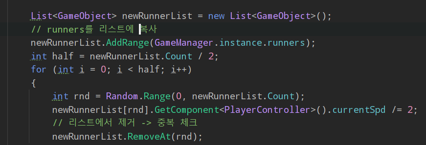 이번 주는 런게임을 클론코딩 하면서 어떤 식으로 구현하면 되는지에 대해서 배웠다. 유투브에 우마무스메를 패러디한 게임인 고메무스메라는 팬 게임과 비슷한 방식으로 구현한 프로젝트를 클론 코딩한 것이다. 수업 중에 캐릭터의 속도에 영향을 주는 이벤트를 전체 캐릭터의 반절에게만 적용하는 코드를 각자 구현해보는 시간이 있었는데 스스로 구현해보는 시간이 있어서 좋았다. 그리고 사람마다 다른 구현 방식이 있어서 다른 방식을 보는 것도 재미 있었던 것 같다. 처음엔 어떻게 구현하면 될까 먼저 구상해보다가 캐릭터를 배열로 담는 것을 시도했는데 배열에서 중복을 제거하는 부분이 어려워서 리스트로 담게 되었다. 리스트의 Contains()를 활용하여 캐릭터가 이미 담겨 졌는지를 확인하고 적용하니까 중복 체크가 잘 되었다. 이렇게 쉽게 구현할 수 있었던 것은 자료구조를 코딩테스트를 통해 틈틈히 공부한 보람이 있었던 것 같다.