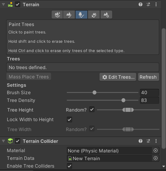 트리가 생성될 범위, 밀도, 높이 랜덤 등 여러가지를 정할 수 있다.