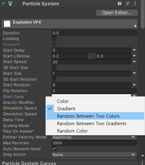 StartColor를 Gradient로 설정하면 위치에따라 색이 바뀐다.