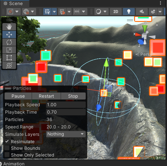 이후 생성한 Material을 씬 창의 파티클 시스템의 Renderer의 Material에 넣어준다.
