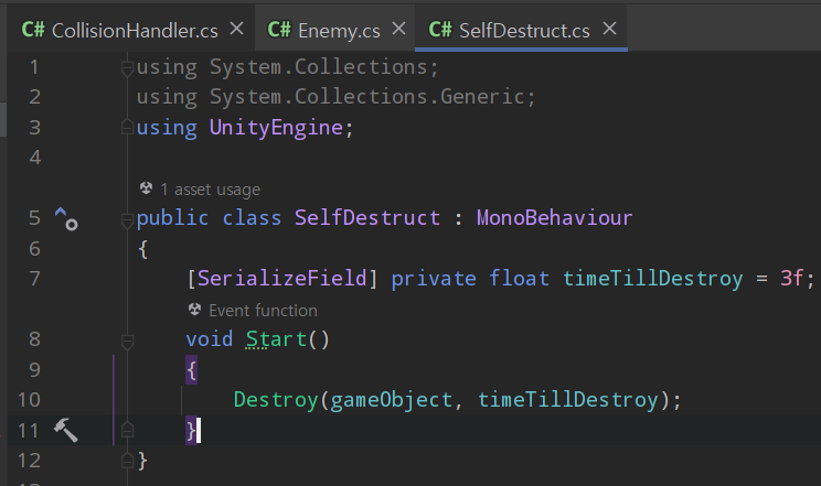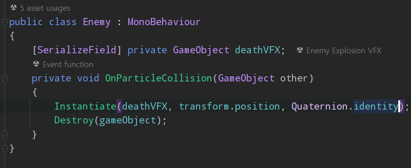 * 적들은 파괴되면서 파티클을 생성하고(에너미 스크립트도 꺼짐) 일정 시간 뒤에 파티클도 꺼줘야하기 때문에 파티클 프리펩에 Self Destruct를 넣어줬다.
