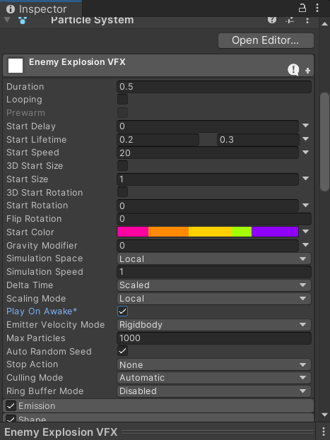 그리고 파티클이 생성 시 Play 되는 걸 원하기 때문에 Play On Awake를 킨다.