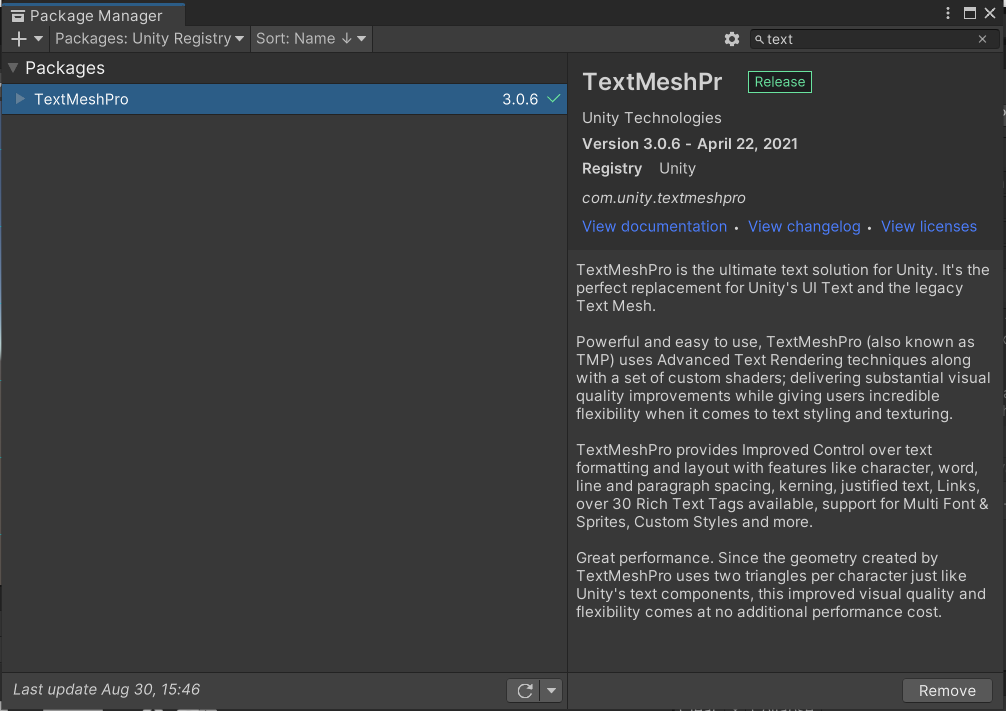 Pakage Manager에서 TextMeshPro를 다운받고 Essential을 설치한 뒤