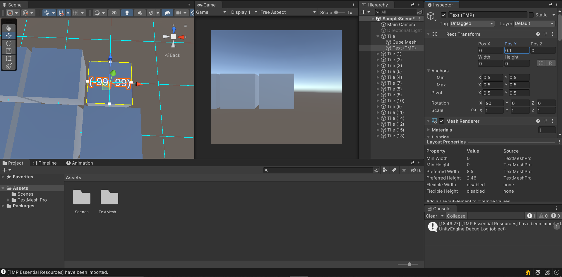 TextMeshPro의 크기를 큐브와 같게 맞췄고 회전을 x축으로 90도를 줬으며 같은 레벨의 Cube Mesh의 y축 좌표를 -4.5만큼 이동했다.