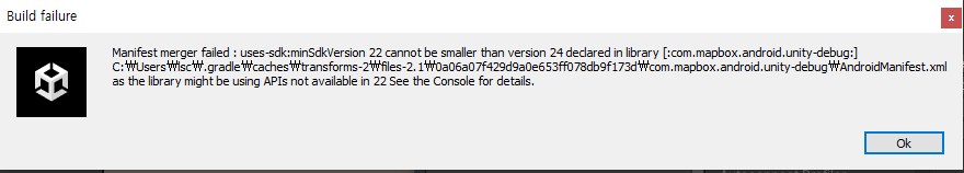 manifest merger failed : uses-sdk minsdkversion~ 해결 방법 [Unity 2021.3.3f1]