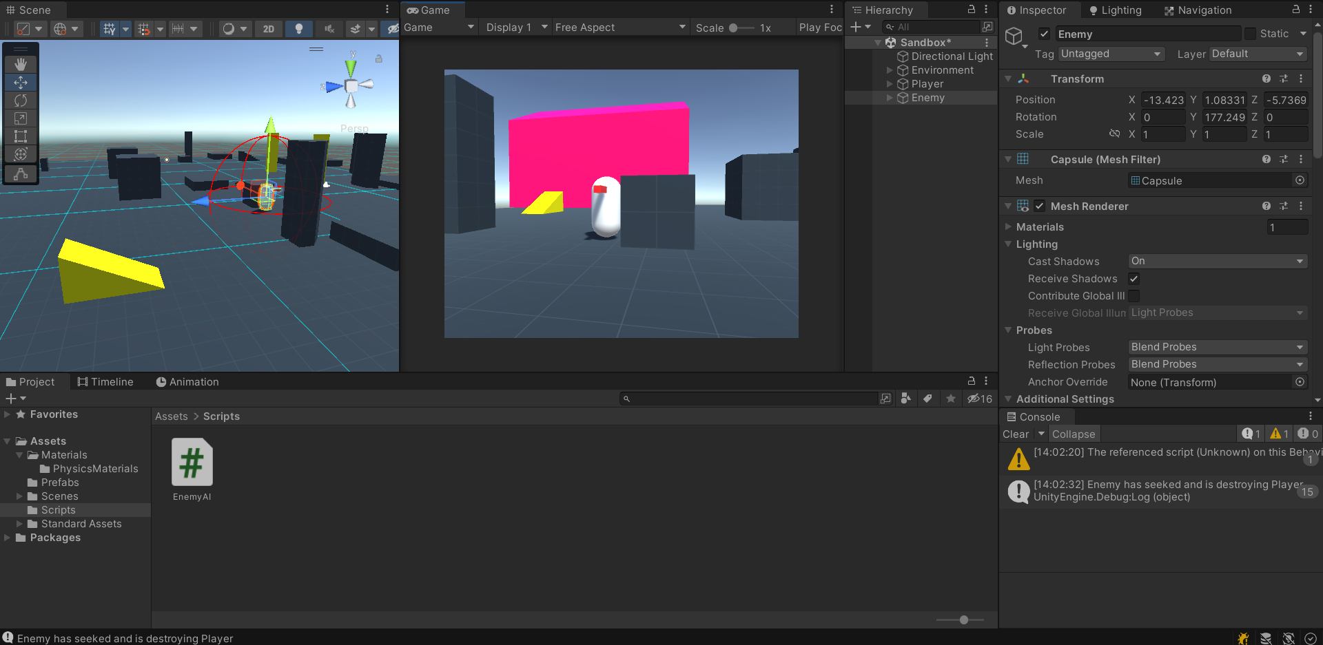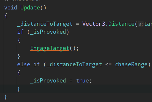 한번 범위에 잡히면 계속 추적하게하고 타겟과의 거리가 navMeshAgent의 stoppingDistance보다 작아지면 공격하게 그 이상이면 계속 따라가게 하였다.