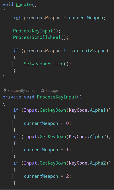 Input을 받아 currentWeapon의 값을 바꿔준다면 Input에 따라 쉽게 무기 교체를 할 수 있다.