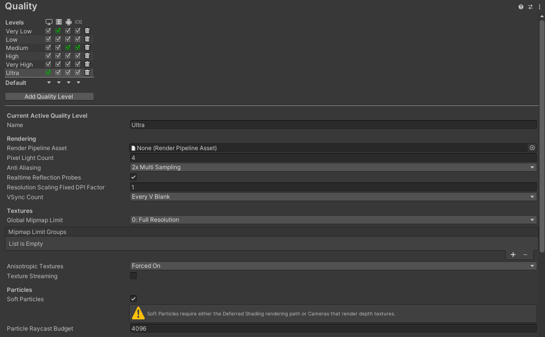 * 만약 Soft Particles가 적용이 안 된다면 (한 톤으로만 적용된다면) Quality의 Soft Particles를 체크해주면 된다.