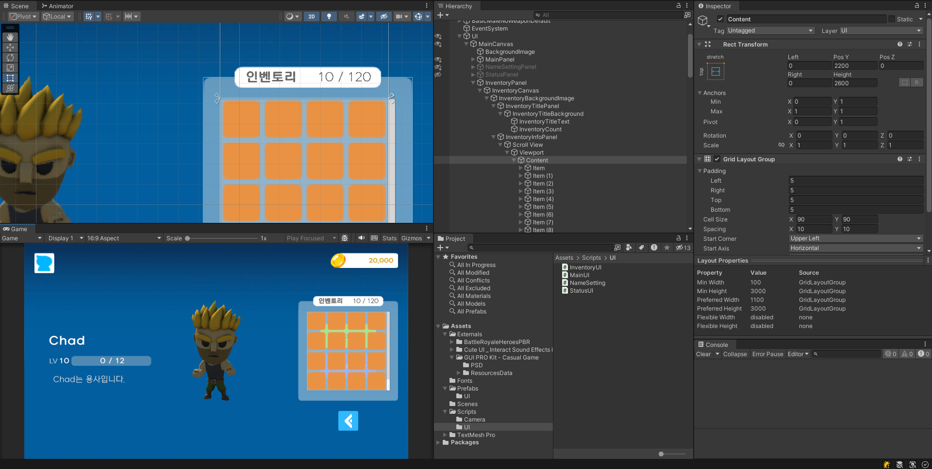내가 구현한 방법 : 먼저 배열에 자식들을 담고 아이템들을 정렬하는 그룹인 Grid Layout Group의 요소들(간격)을 가져와 아이템 사이즈와 더했다. 그 이후 아이템의 열 개수 만큼(세로 스크롤) 사이즈를 늘려주도록 했다.